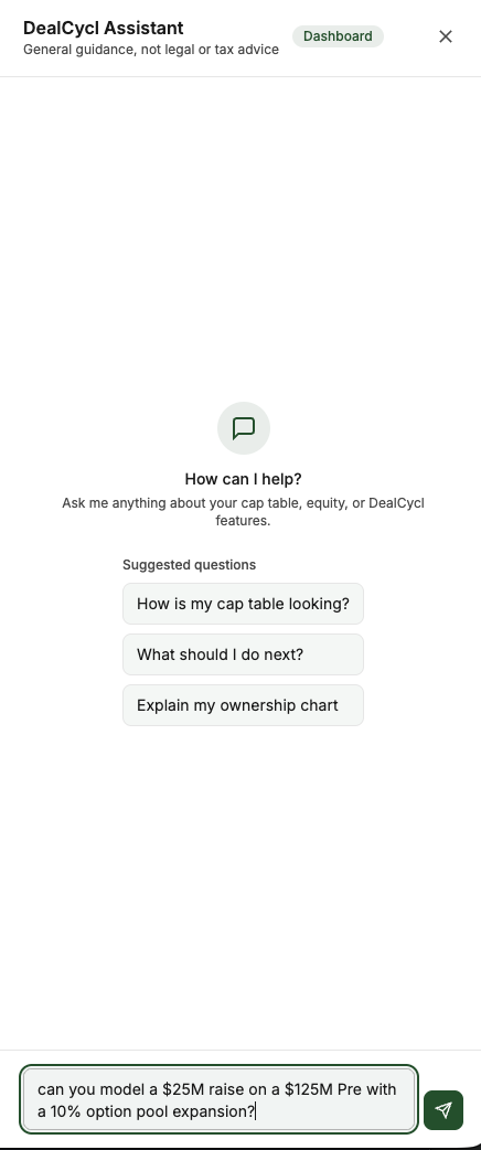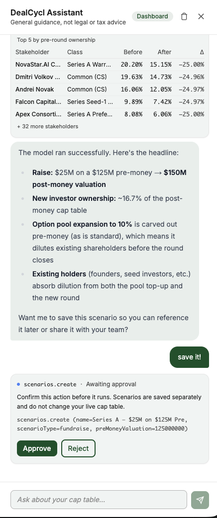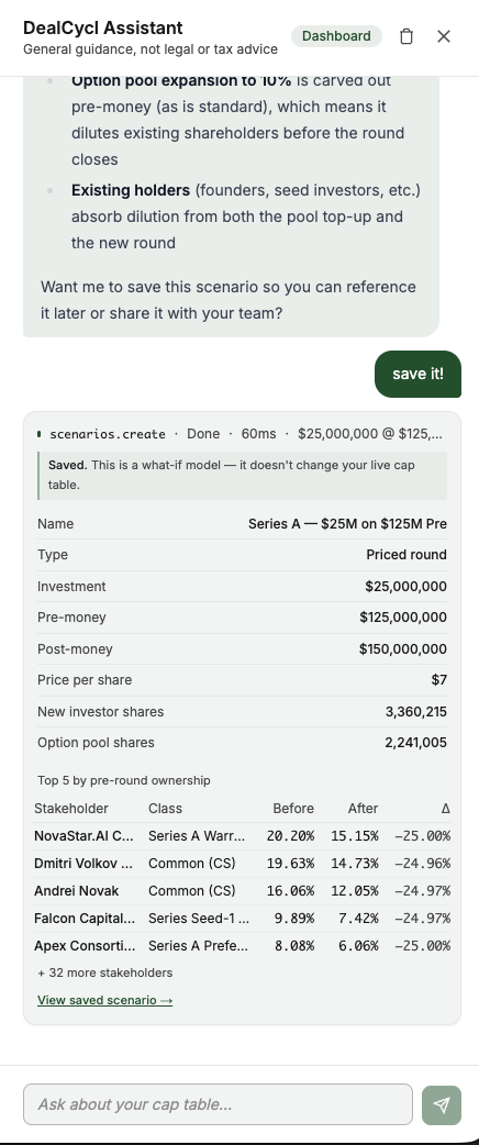 Here's the embedded assistant in DealCycl, walking through a real priced-round model on a real cap table — from a one-sentence question to a saved scenario, no UI clicks required.